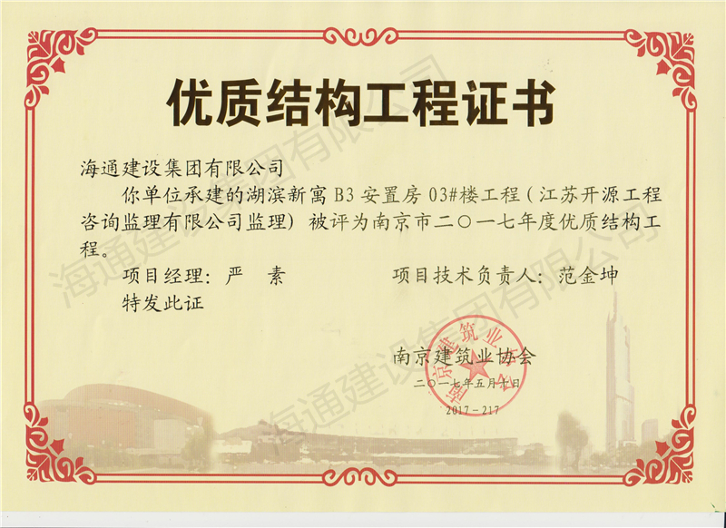 南京市優質結構2017湖濱新寓B3安置房02#樓工程榮獲