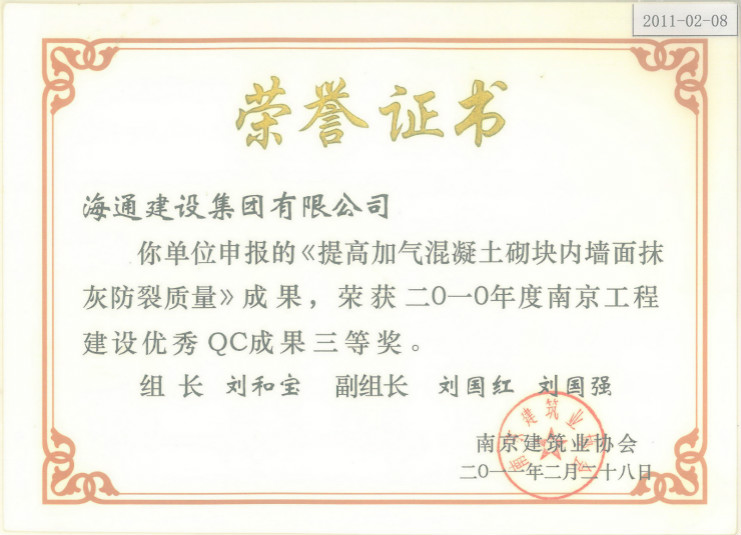南京工程建設優秀QC成果二等獎