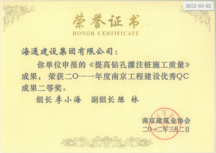 2011年度南京工程建設(shè)優(yōu)秀QC成果二等獎