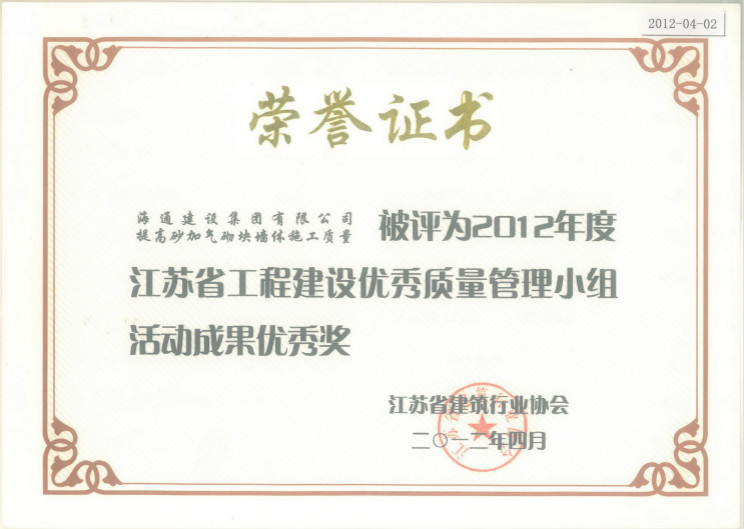 2012年度江蘇省工程建設優秀質量管理小組活動成果優秀獎