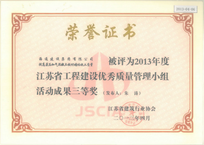 2103年度江蘇省工程建設優秀質量管理小組活動成果三等獎