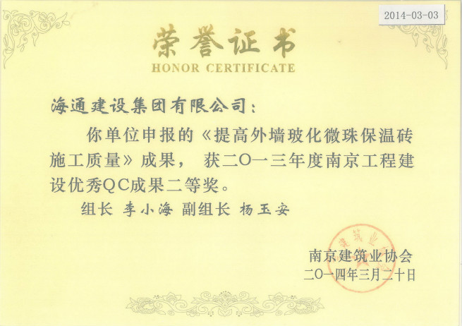 南京工程建設(shè)優(yōu)秀QC成果二等獎