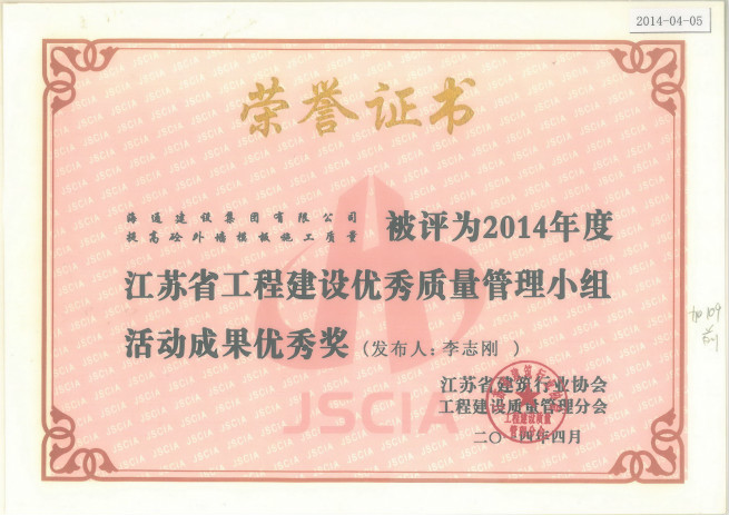 2014年度江蘇工程建設優秀質量管理小組活動成果優秀獎