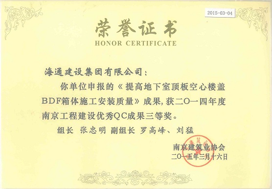 南京工程建設優(yōu)秀QC成果三等獎