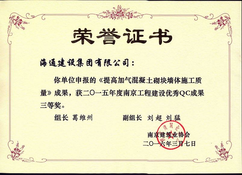 南京工程建設優秀QC成果三等獎
