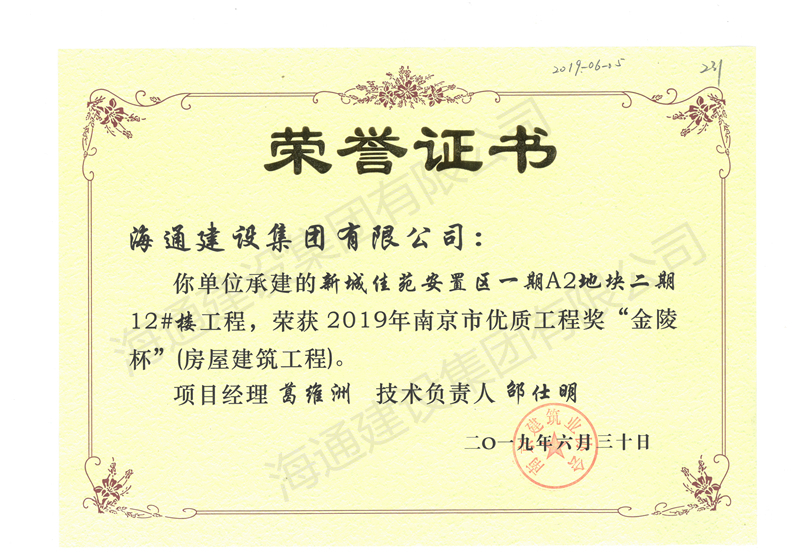 南京市金陵杯2019新城佳苑安置區一期A2地塊12#樓工程