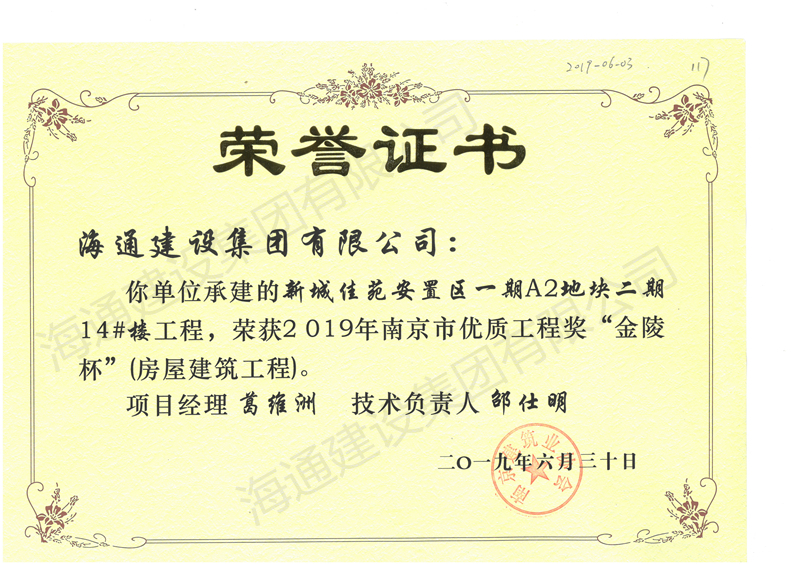 南京市金陵杯2019新城佳苑安置區一期A2地塊14#樓工程