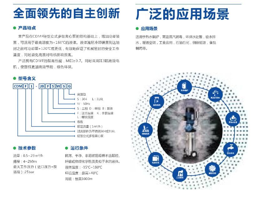 南方離心泵 南方高溫型CDMF輕型立式多級離心泵 高溫泵在CDMF輕型立式多級離心泵的結構基礎上,增加冷卻裝置,可適用于最高溫度為+180攝氏度的液體。液體流經冷卻裝置到達軸封之前可冷卻至+120℃或更低,有效地保證了機械密封的安全工作溫度,同時避免高溫對電機影響損害。 性能參數 標簽 產品介紹 相關產品 南方泵業ZS系列不銹鋼臥式單級泵機… 南方PQ不銹鋼噴泉專用潛水電泵 南方泵業CDL/CDLF120系列熱水型機… 南方CDLF+CDH,HP高壓泵 南方VMHP膜法海水淡化高壓泵 南方SJ不銹鋼多級深井潛水電泵